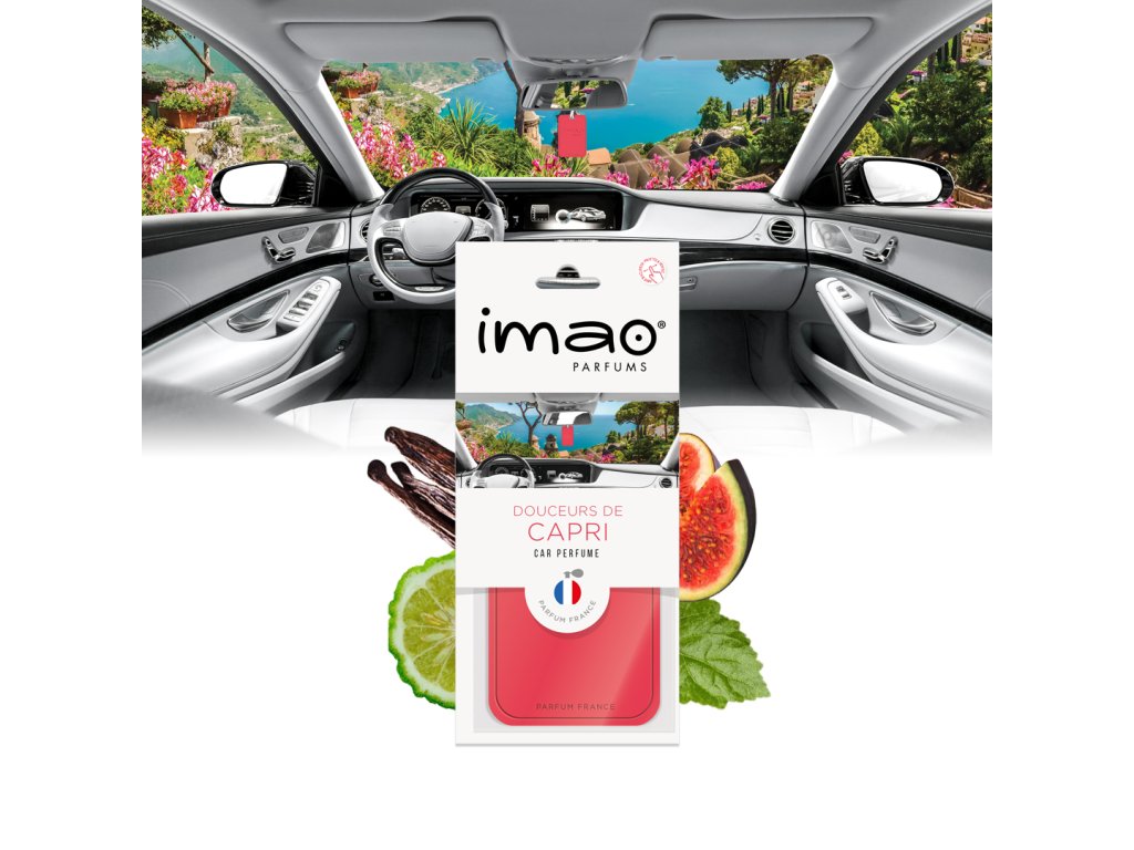 Osvěžovač Imao CAR PERFUME "Douceurs de CAPRI" vás díky podmanivé vůni s tóny bergamotu, mandarinky, fíků, pačuli a vanilky přenese na písčité pláže oblíbeného italského městečka.