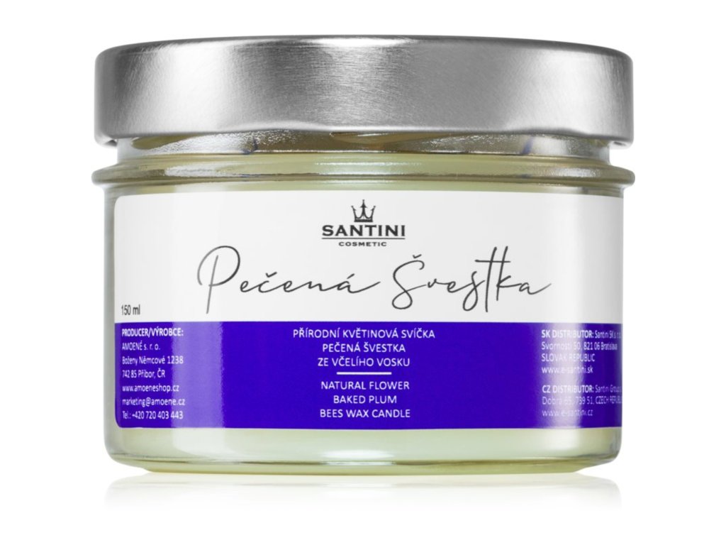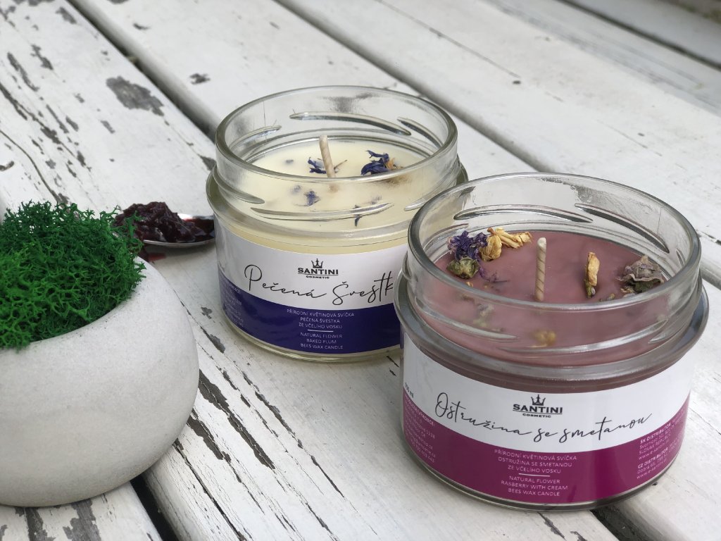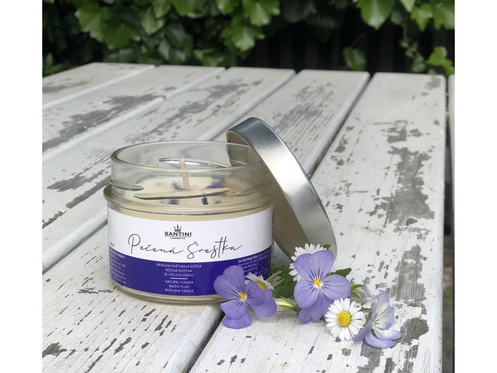 Vonná svíčka s přírodním včelím voskem a bavlněným knotem, kterou zkrášlují kousky voňavých sušených květů, a ve které se snoubí přírodní hřejivá vůně slaďoučkých pečených švestek.